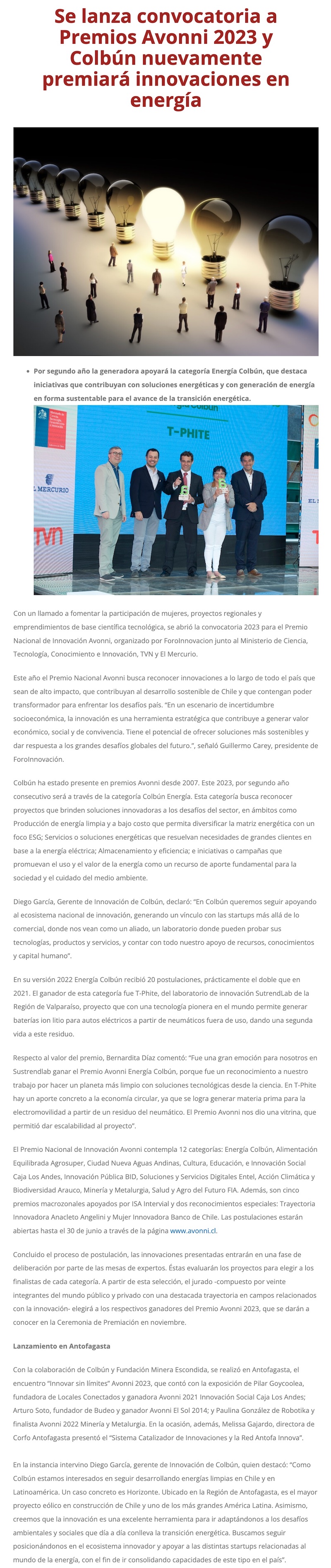 Se lanza convocatoria a Premios Avonni 2023 y Colbún nuevamente premiará innovaciones en energía - (rln.cl)