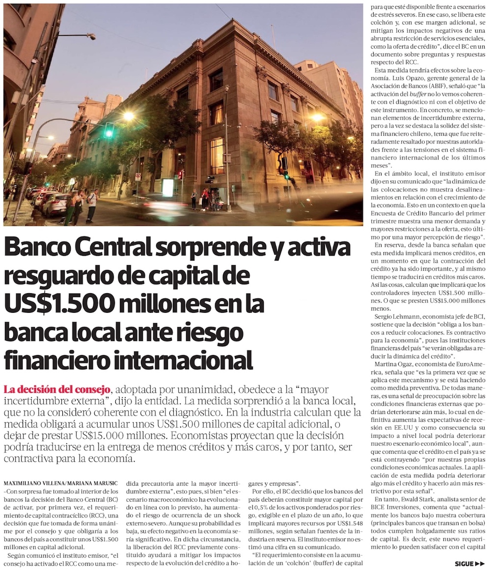 Banco Central activa exigencia de capital contracíclico para la banca por deterioro de situación externa - (Diario Financiero)