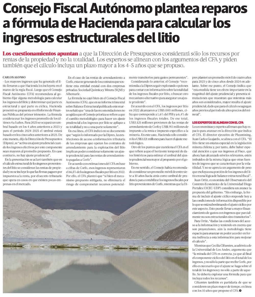 CFA valora que Hacienda ahorre parte de ingresos del litio, pero advierte de riesgos futuros - (Diario Financiero)
