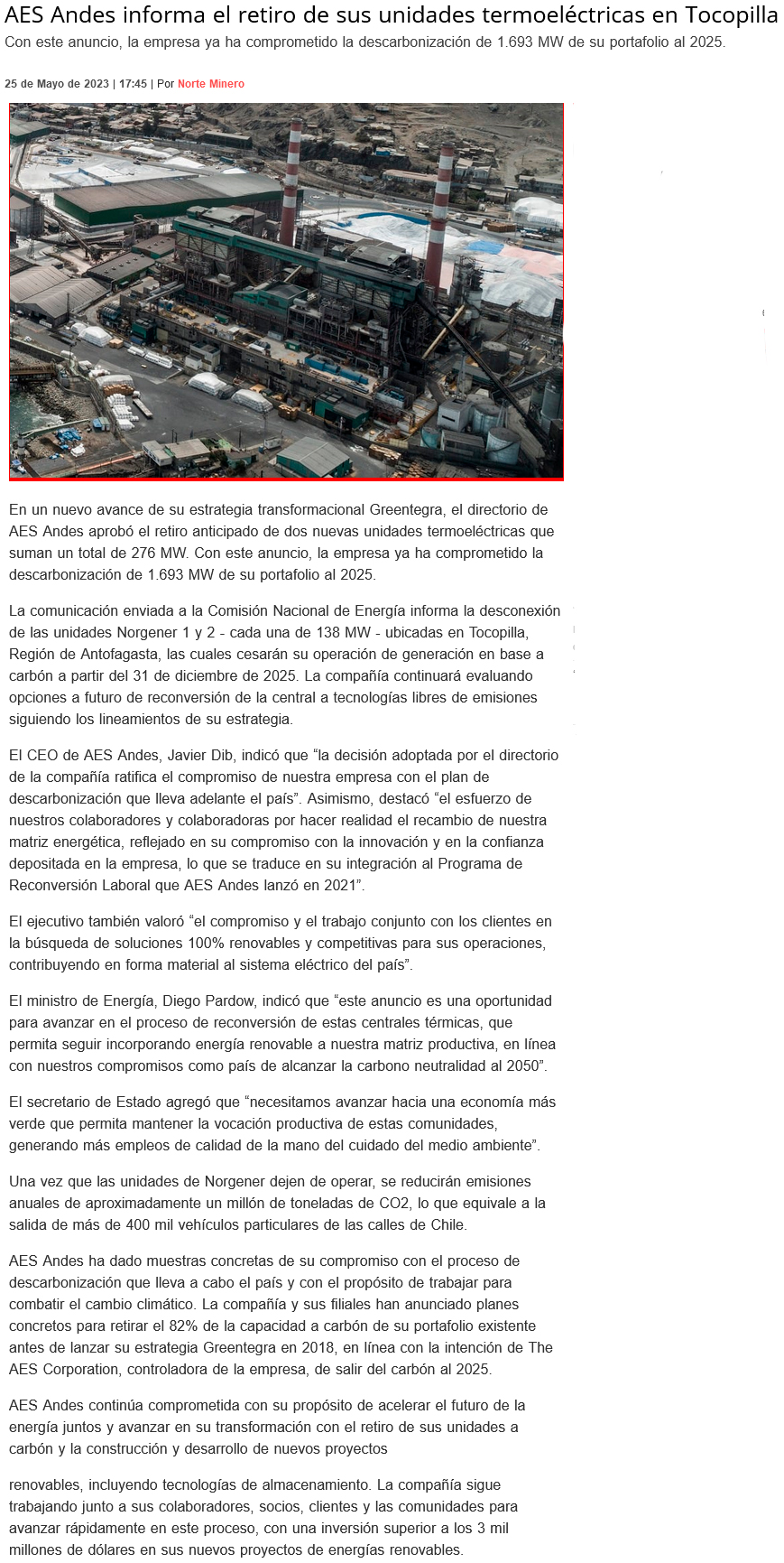 AES Andes informa retiro de dos unidades termoeléctricas en Tocopilla para 2025 - (Diario Financiero)