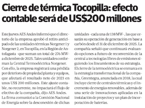 AES Andes anuncia retiro de centrales a carbón - (El Mercurio de Santiago)