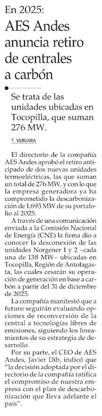 AES Andes informa retiro de dos unidades termoeléctricas en Tocopilla para 2025 - (Diario Financiero)