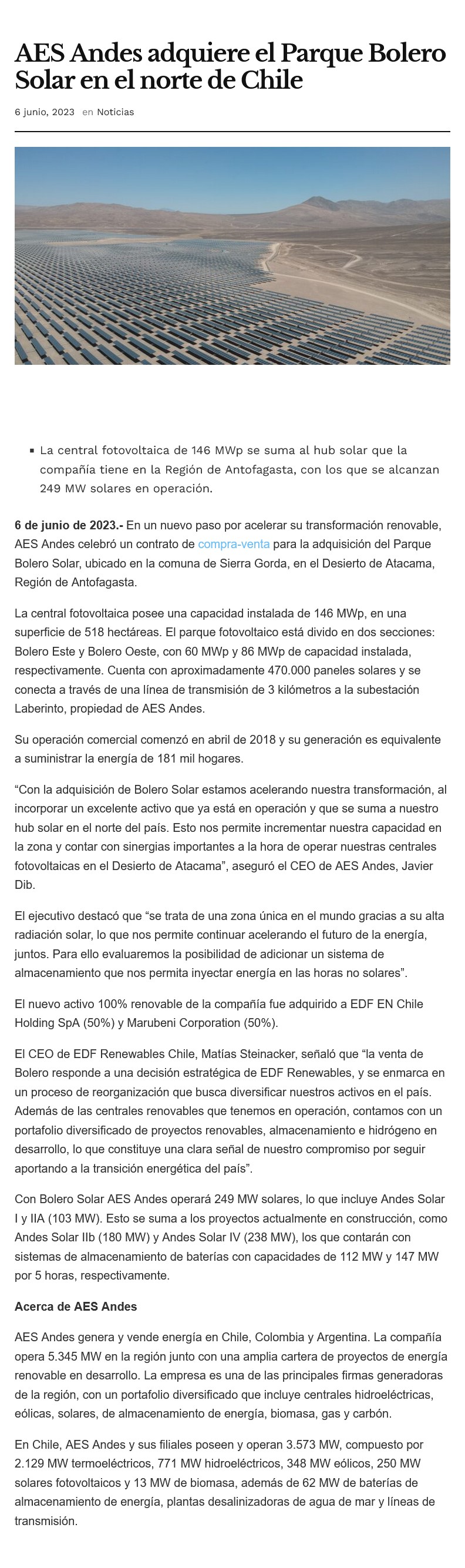 AES Andes adquirió Parque Bolero Solar de 146 MWp que está ubicado en Sierra Gorda - (norteminero online)