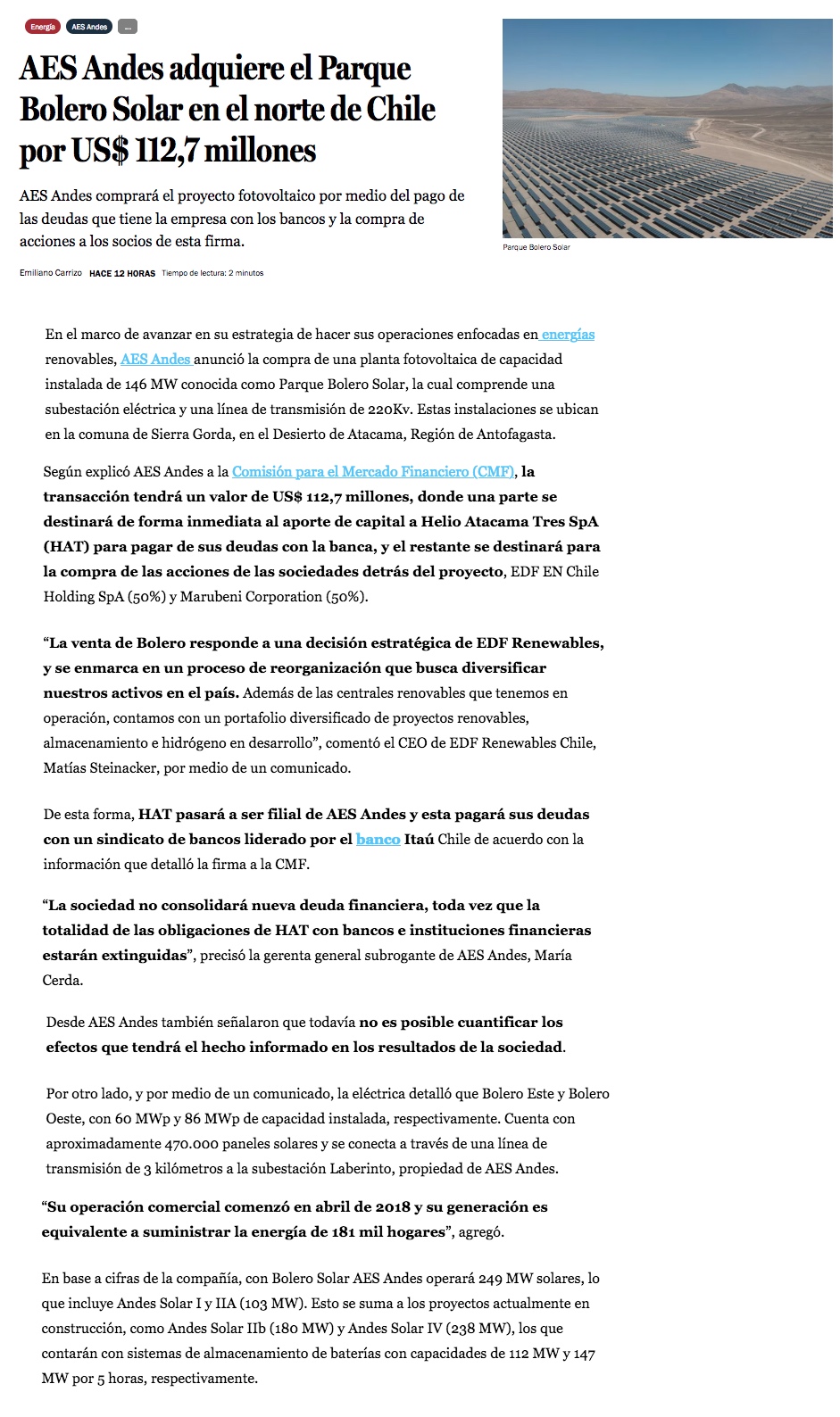 AES Andes adquiere parque fotovoltaico en Antofagasta por US$ 112 millones - (El Mercurio de Santiago)