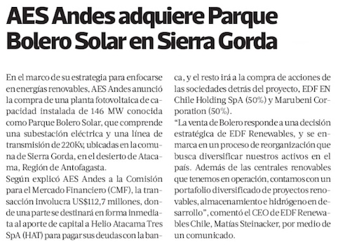 AES Andes adquiere parque fotovoltaico en Antofagasta por US$ 112 millones - (El Mercurio de Santiago)