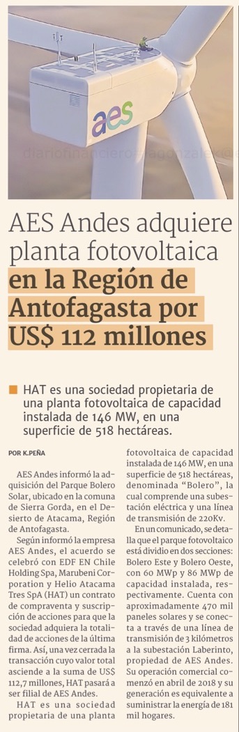 AES Andes adquiere parque fotovoltaico en Antofagasta por US$ 112 millones - (El Mercurio de Santiago)