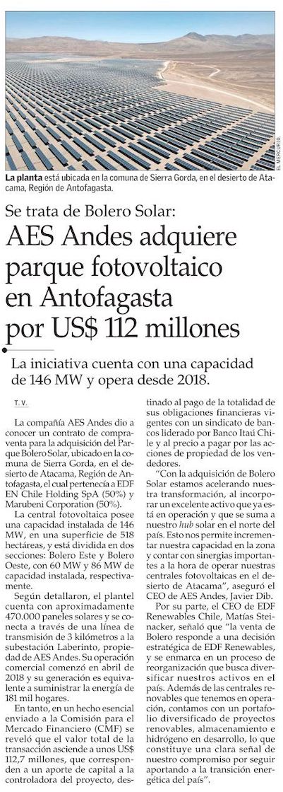 AES Andes adquiere el Parque Bolero Solar en el norte de Chile por US$ 112,7 millones - (Pulso Online)