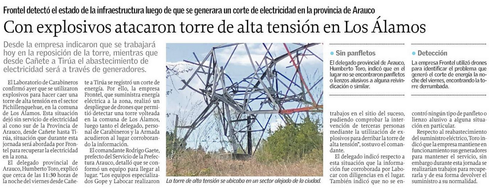 Gobierno confirma uso de explosivos en ataque a torre eléctrica - (Diario Concepción)