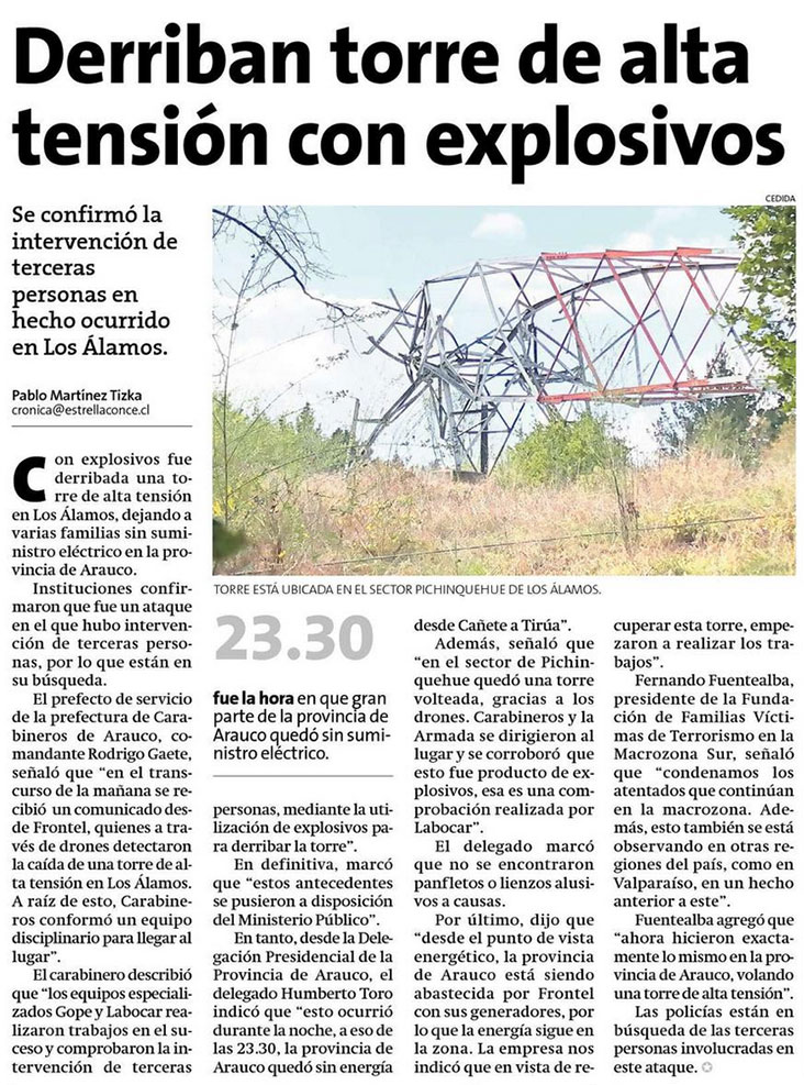 Gobierno confirma uso de explosivos en ataque a torre eléctrica - (Diario Concepción)