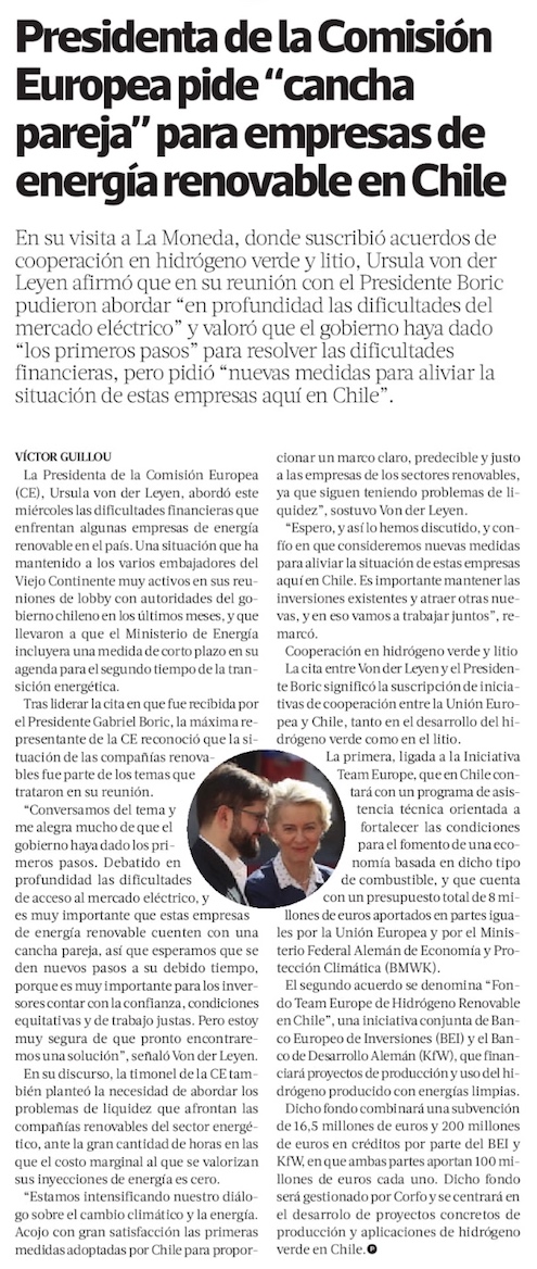 Von der Leyen y crisis de renovables: pide a Boric “cancha pareja” y medidas que “alivien” su situación - (Diario Financiero)
