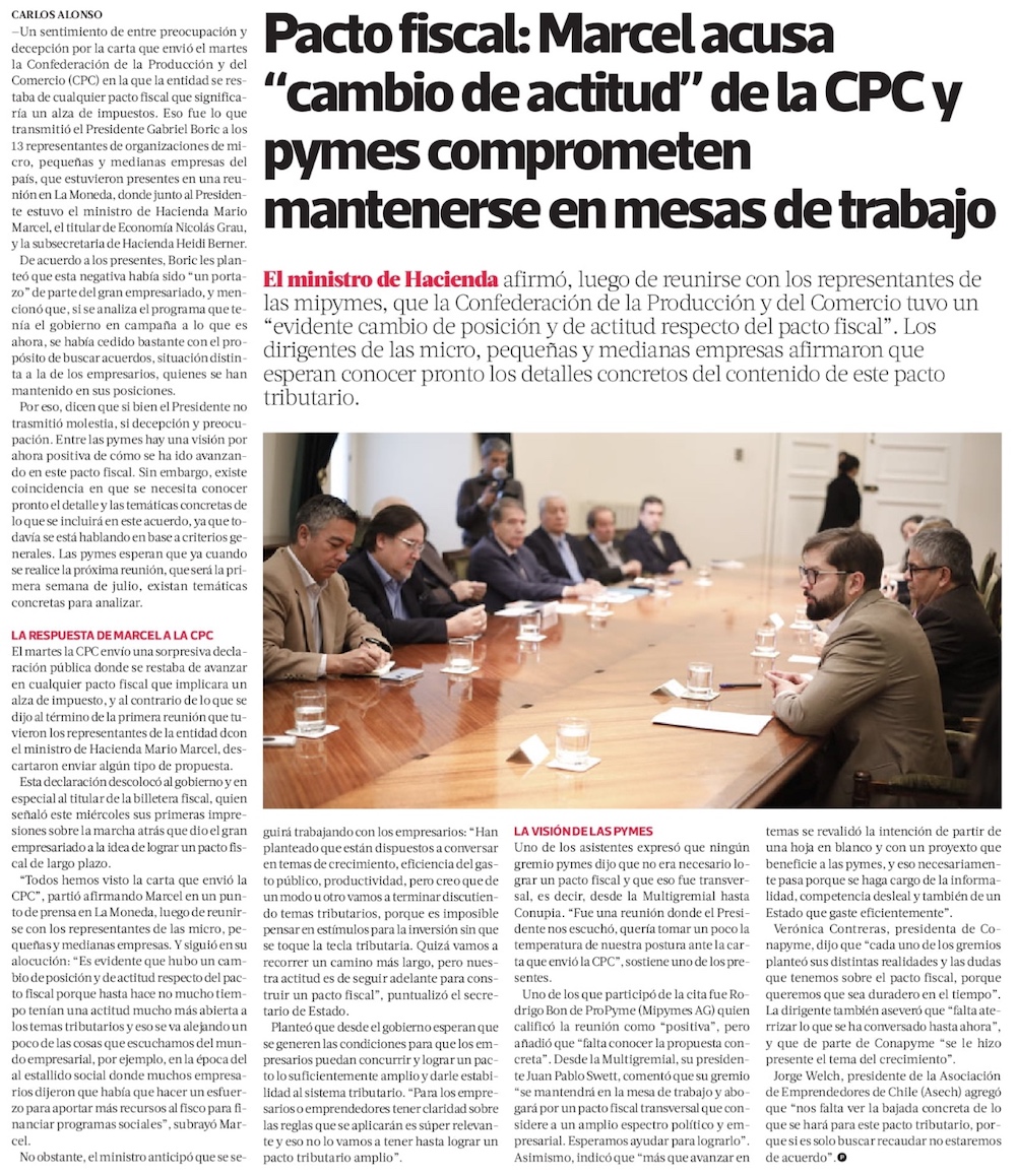 Marcel a la CPC por portonazo a pacto fiscal: “En el estallido social muchos empresarios dijeron que había que hacer un esfuerzo” - (Diario Financiero)