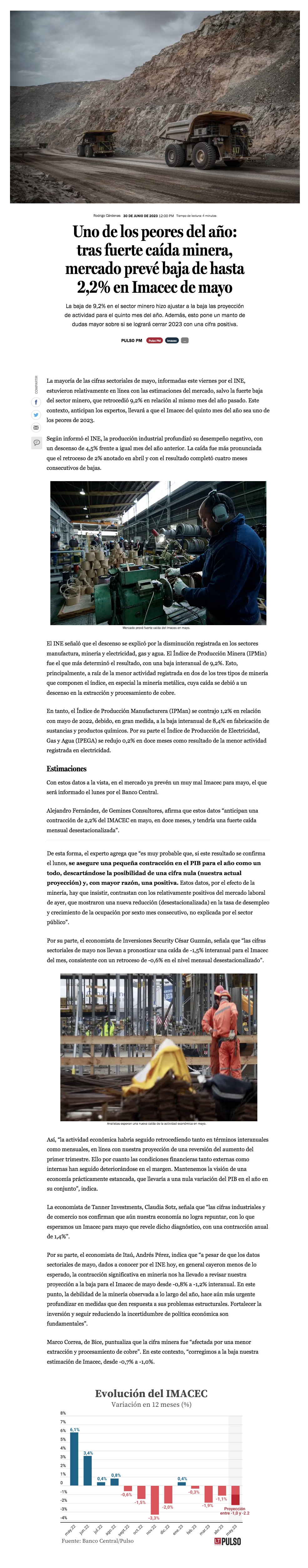 Mercado prevé caída de hasta 2,2% en Imacec de mayo por la minería - (Pulso)