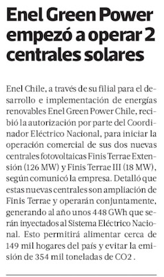 Enel pone en operaciones dos nuevos proyectos fotovoltaicos - (El Mercurio de Calama)