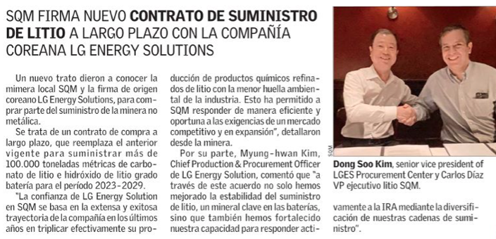 SQM acuerda nuevo contrato de suministro de litio a largo plazo con LG Energy Solution - (DF Online)