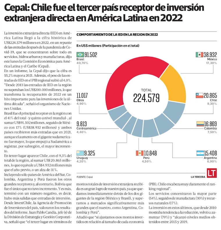 América Latina marcó máximo de inversión extranjera directa en 2022 y Chile quedó en el tercer lugar - (Diario Financiero)