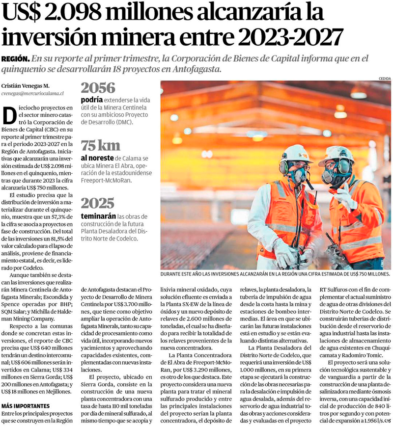 US$ 2.098 millones alcanzaría la inversión minera entre 2023-2027 - (El Mercurio de Calama)
