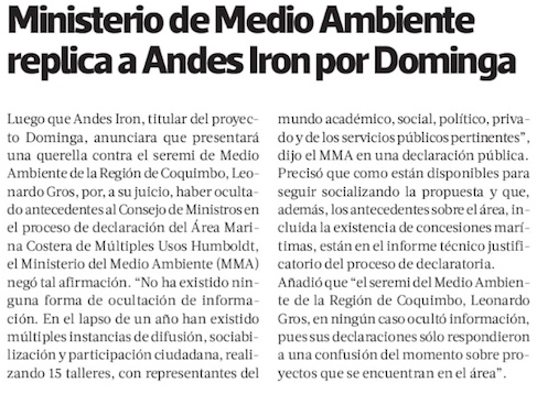 Medio Ambiente respalda a seremi tras acusación de Dominga de omitir información - (Diario Financiero)