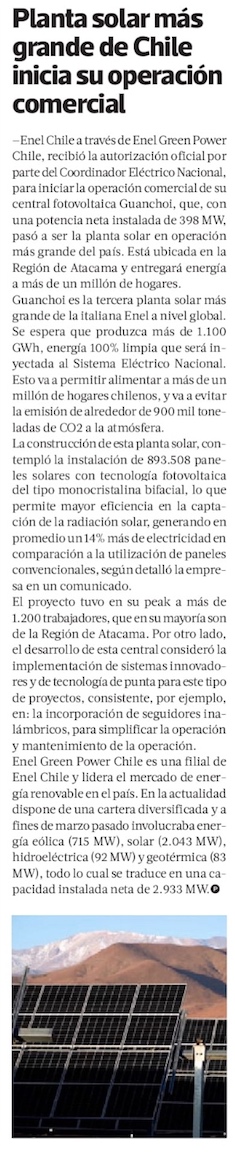 Enel Green Power anuncia operación comercial de la planta solar más grande de Chile - (revistaei.cl)