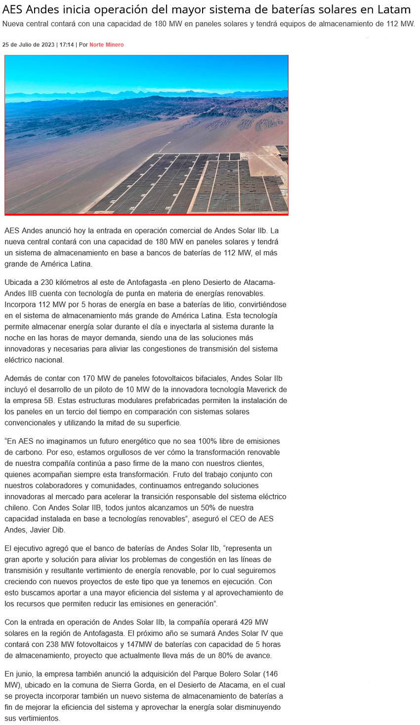 AES Andes inicia operación del mayor sistema de baterías de almacenamiento solar de América Latina - (Pulso Online)