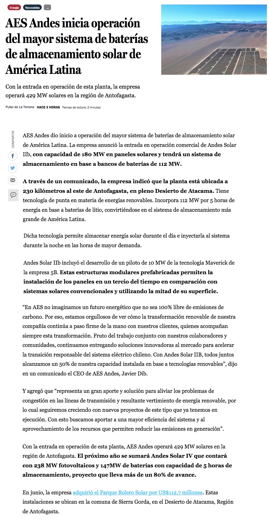 AES Andes inicia operación del mayor sistema de baterías solares en Latam - (norteminero online)