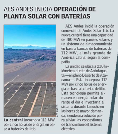 AES Andes inicia operación del mayor sistema de baterías solares en Latam - (norteminero online)