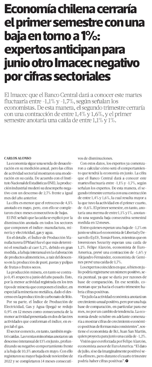 Los principales indicadores fueron negativos en junio y los economistas anticipan que el Imacec varíe entre -1,2% y -1,7% - (El Mercurio de Santiago)
