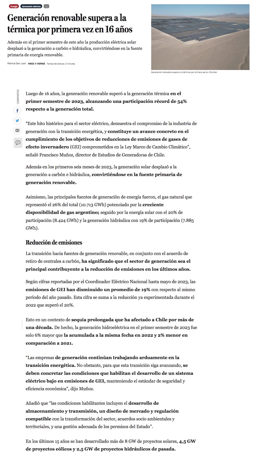 Generación renovable supera a la térmica por primera vez en 16 años - (Pulso)