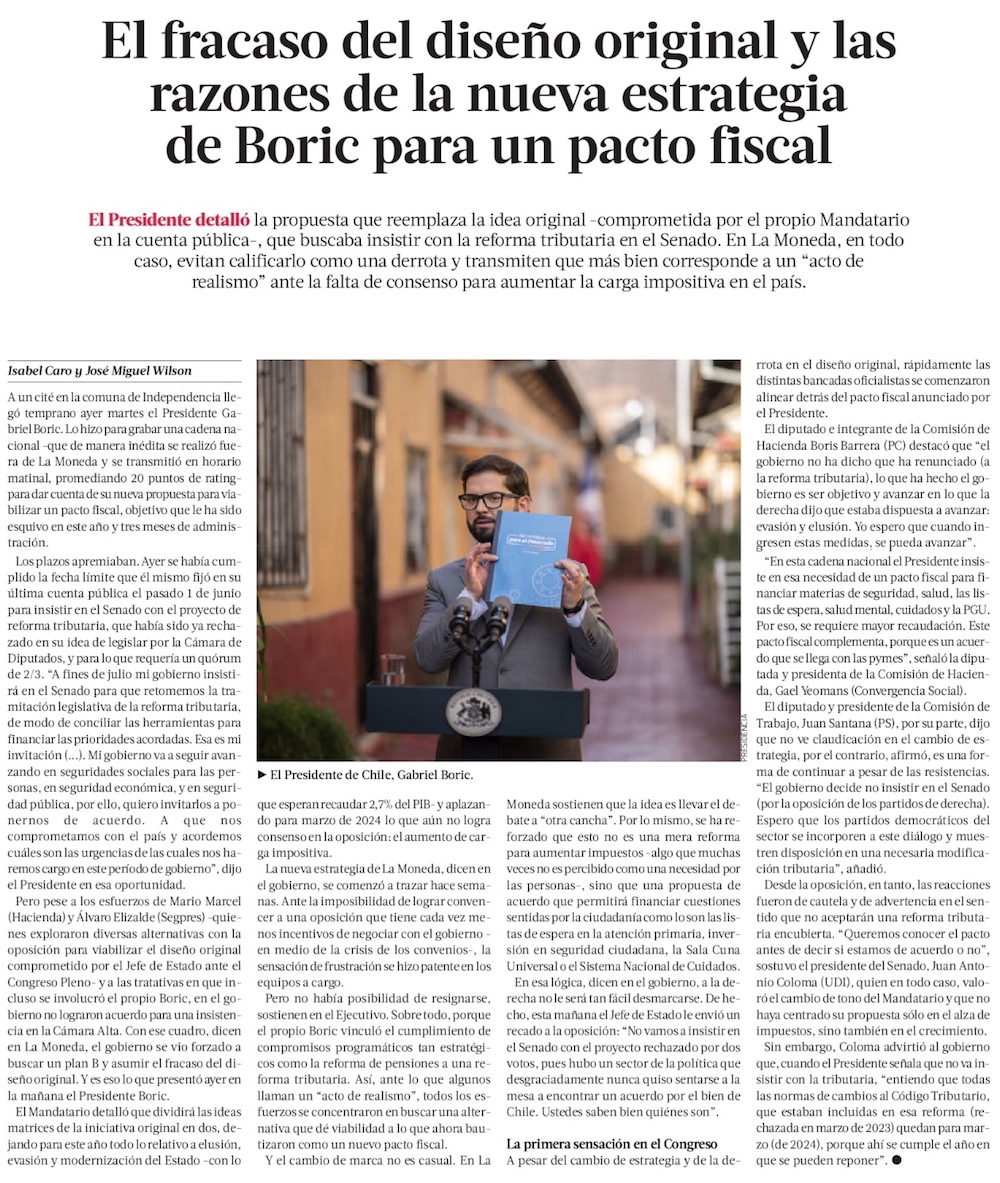 Pacto fiscal: Boric busca recaudar 2,7% del PIB, desecha insistencia en el Senado y renuncia a impuesto al patrimonio y a las utilidades retenidas - (Diario Financiero)