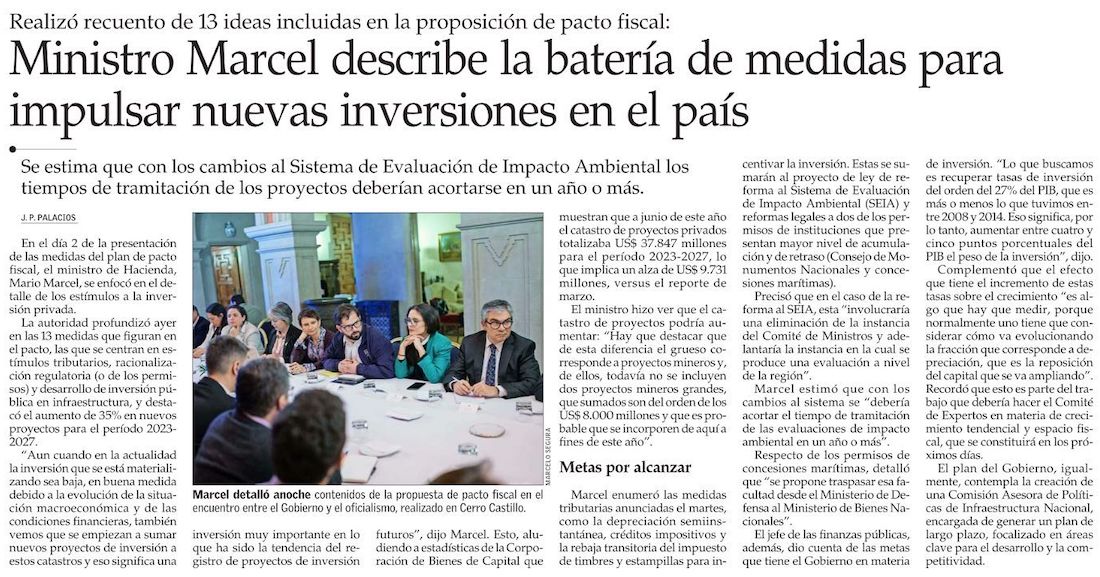 Hacienda calcula que medidas aumentarán el peso de la inversión entre cuatro y cinco puntos del PIB - (Diario Financiero)