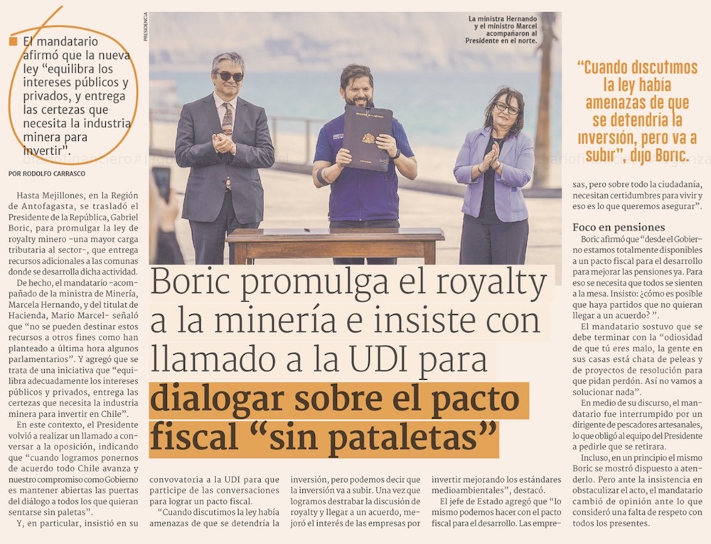 Boric promulga la ley de royalty minero y pide seguir ese ejemplo para avanzar en el pacto fiscal y la reforma previsional - (Pulso)