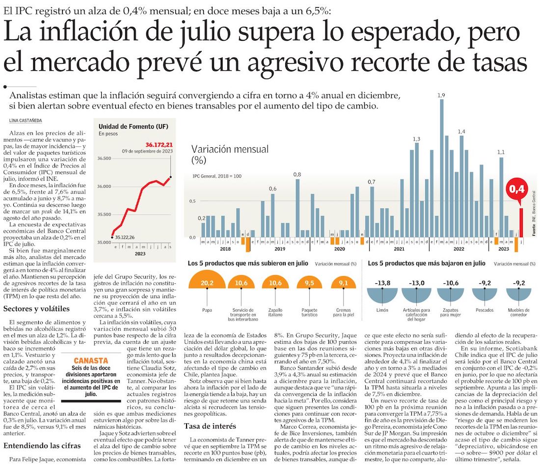 El IPC de julio da nuevas pistas de moderación, pero el mercado mira atento alza del dólar y alimentos - (Diario Financiero)