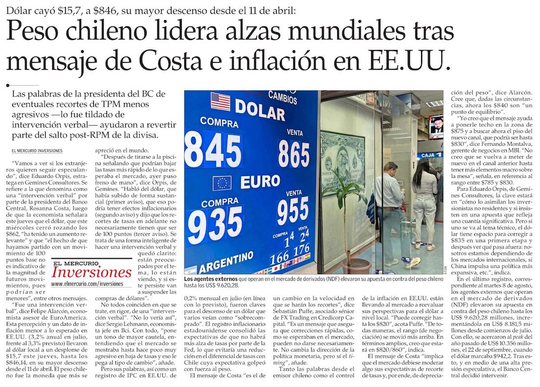 En medio de alza del dólar, Costa abre la puerta a que próximos recortes de tasa sean menores a los 100 puntos de julio - (Diario Financiero)