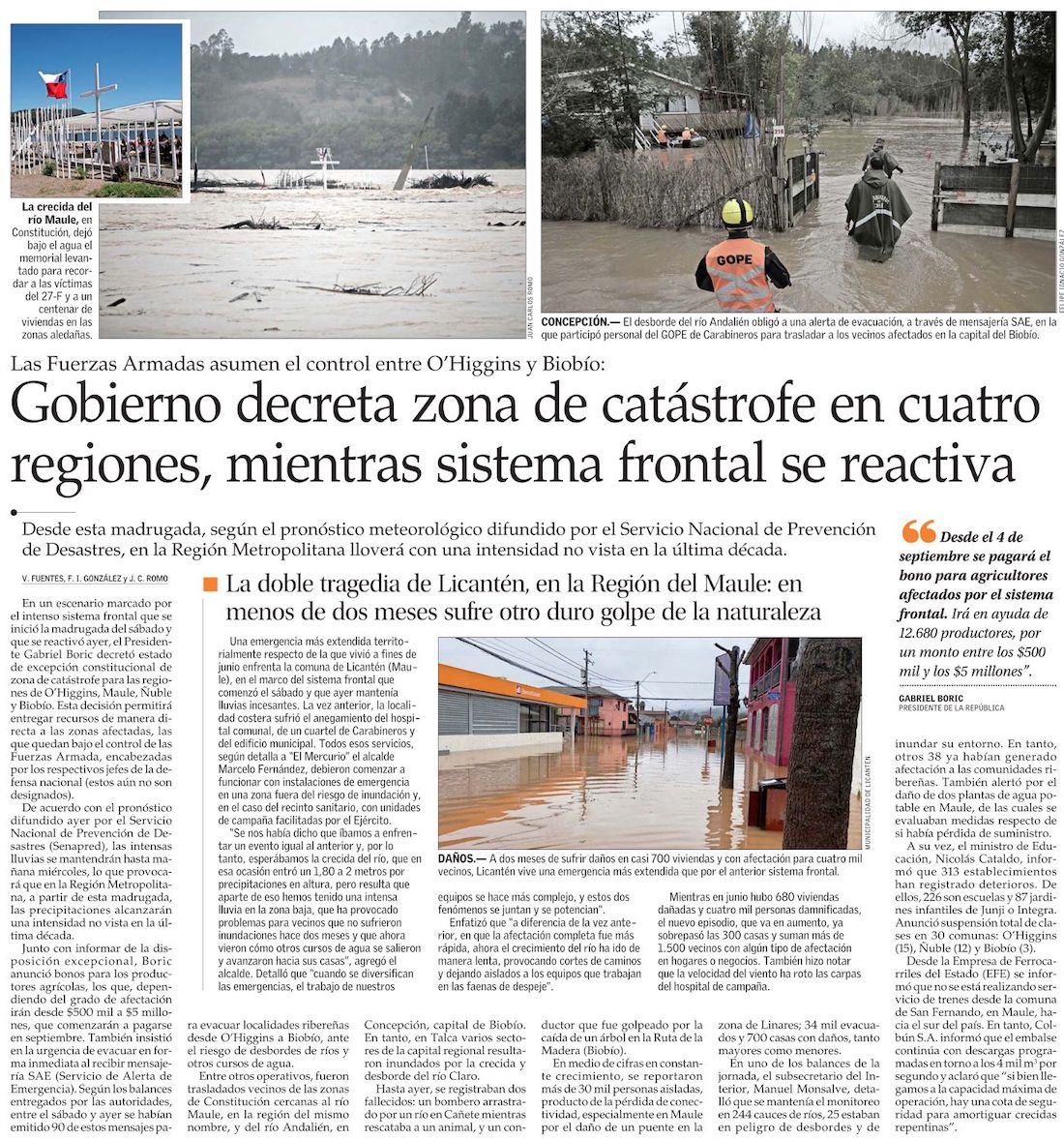 Sistema frontal: declaran estado de catástrofe en zona centro sur en medio de alerta entre agricultores - (Diario Financiero)