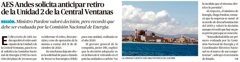 AES Andes solicita retiro anticipado y definitivo de Ventanas 2: A contar del 31 de diciembre - (revistaei.cl)