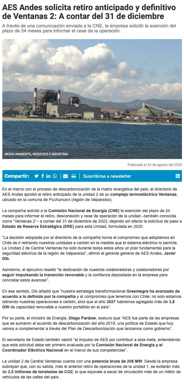 AES Andes solicita anticipar retiro de la Unidad 2 de la Central Ventanas - (El Mercurio de Valparaíso)