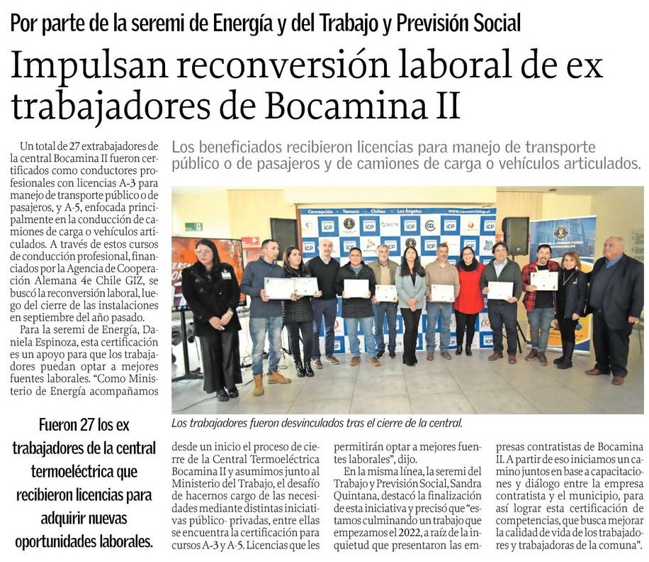 Reconversión laboral de extrabajadores de Bocamina 2: Transporte público, camiones de carga o vehículos articulados - (reportesostenible.cl)