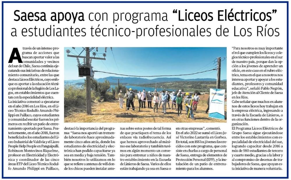 Saesa apoya con programa "Liceos Eléctricos" a estudiantes técnicos-profesionales de los Lagos - (El Austral de Osorno)