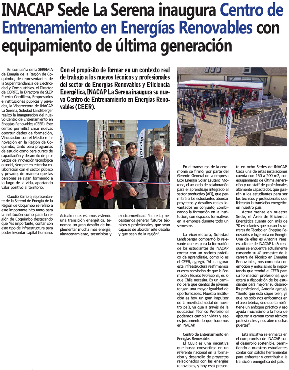 Inacap inaugura Centro de Energías Renovables con equipamiento de última generación - (El Día)