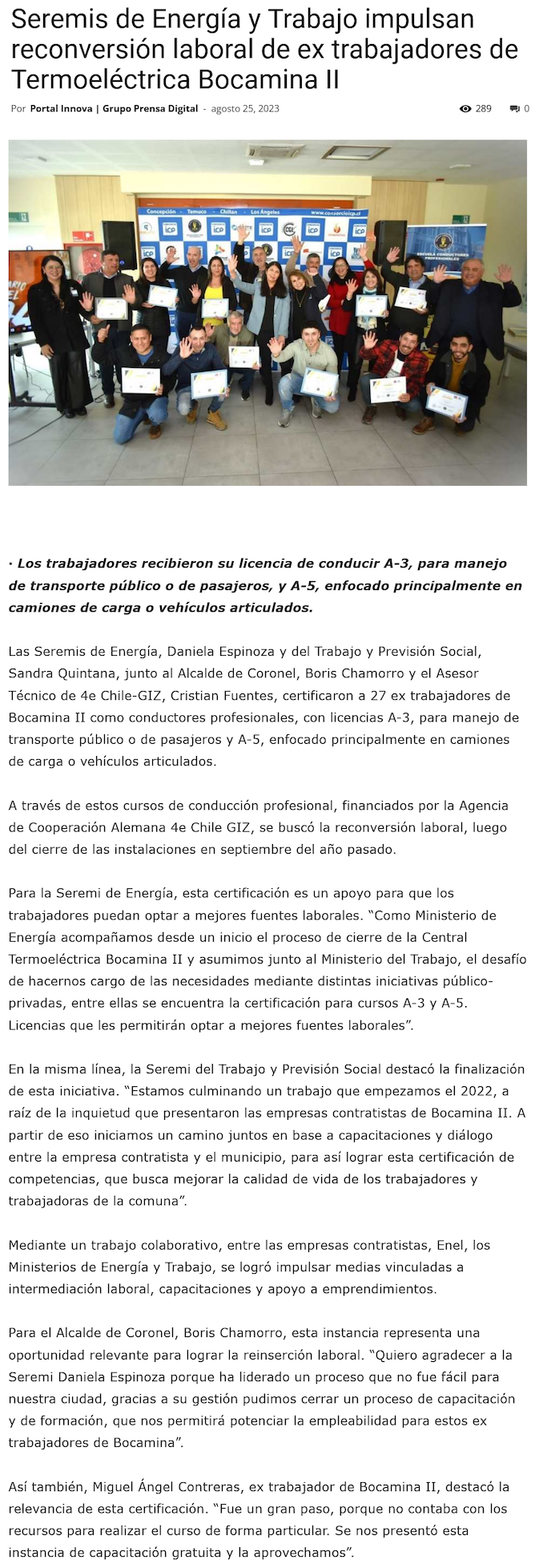 Reconversión laboral de extrabajadores de Bocamina 2: Transporte público, camiones de carga o vehículos articulados - (reportesostenible.cl)