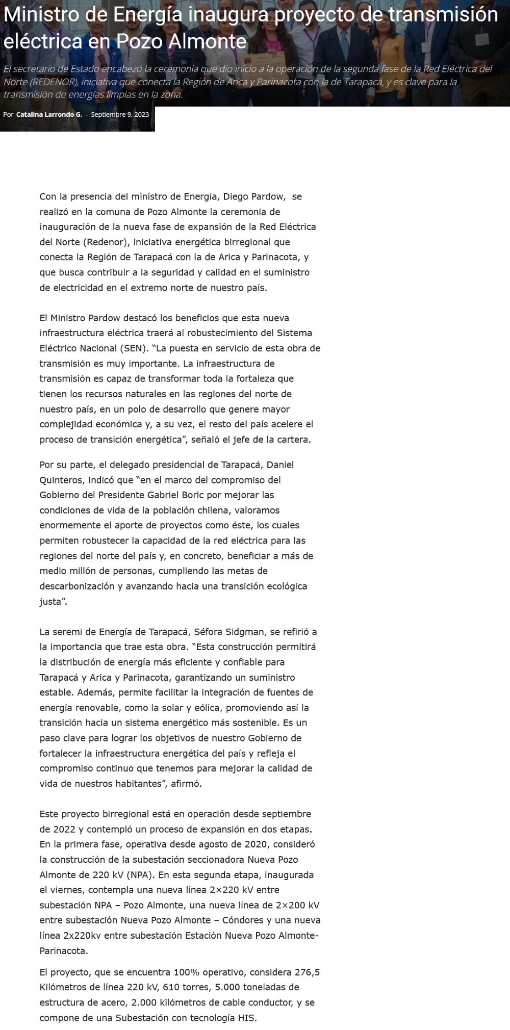 Ministro de Energía inaugura entrada en operación de la segunda etapa del proyecto REDENOR - (infogate.cl)