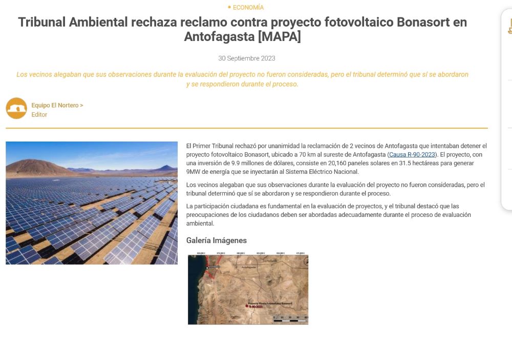 Tribunal Ambiental rechaza reclamación contra el proyecto fotovoltaico Bonasort - (El Mercurio de Calama)