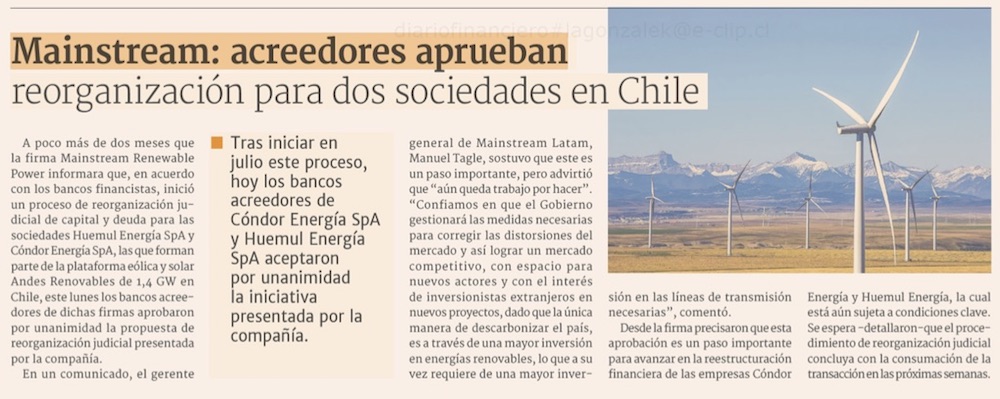 Acreedores: Aprueban propuesta de reorganización de filiales de Mainstream - (El Mercurio de Santiago)