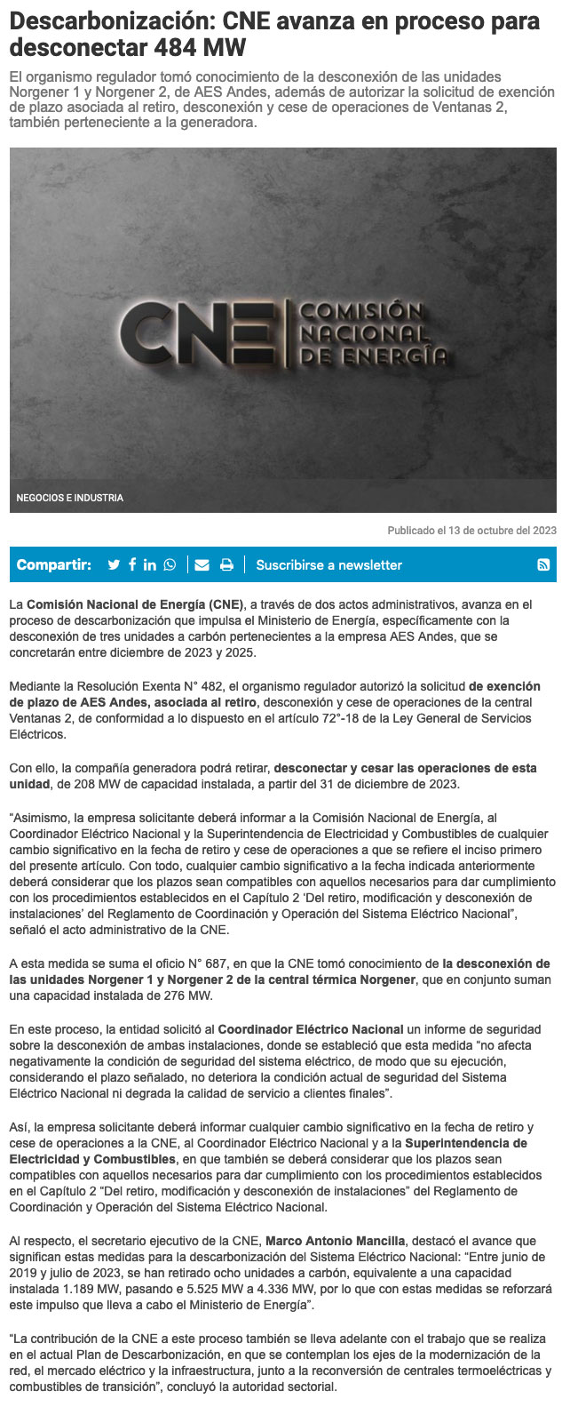 CNE avanza en proceso de descarbonización con miras a desconectar 484 MW de carbón - (El Mercurio de Antofagasta)
