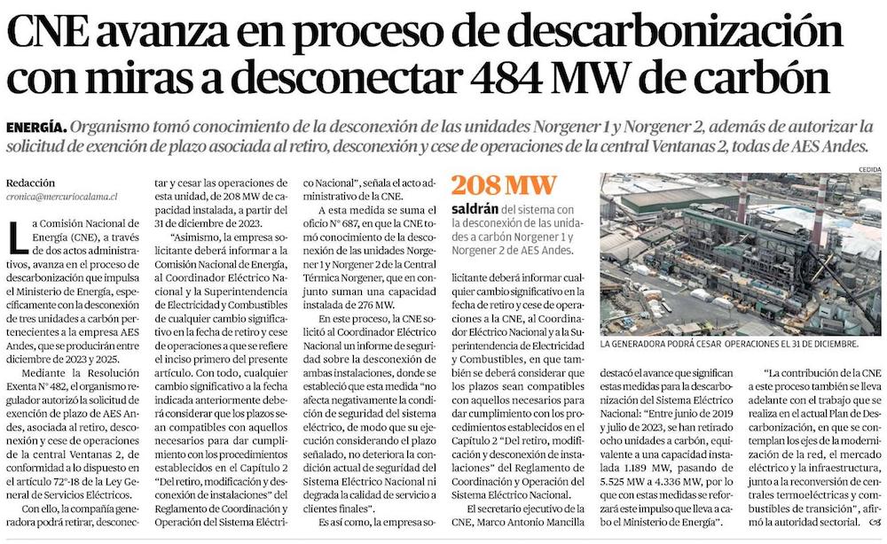 CNE avanza en proceso de descarbonización con miras a desconectar 484 MW de carbón - (El Mercurio de Calama)