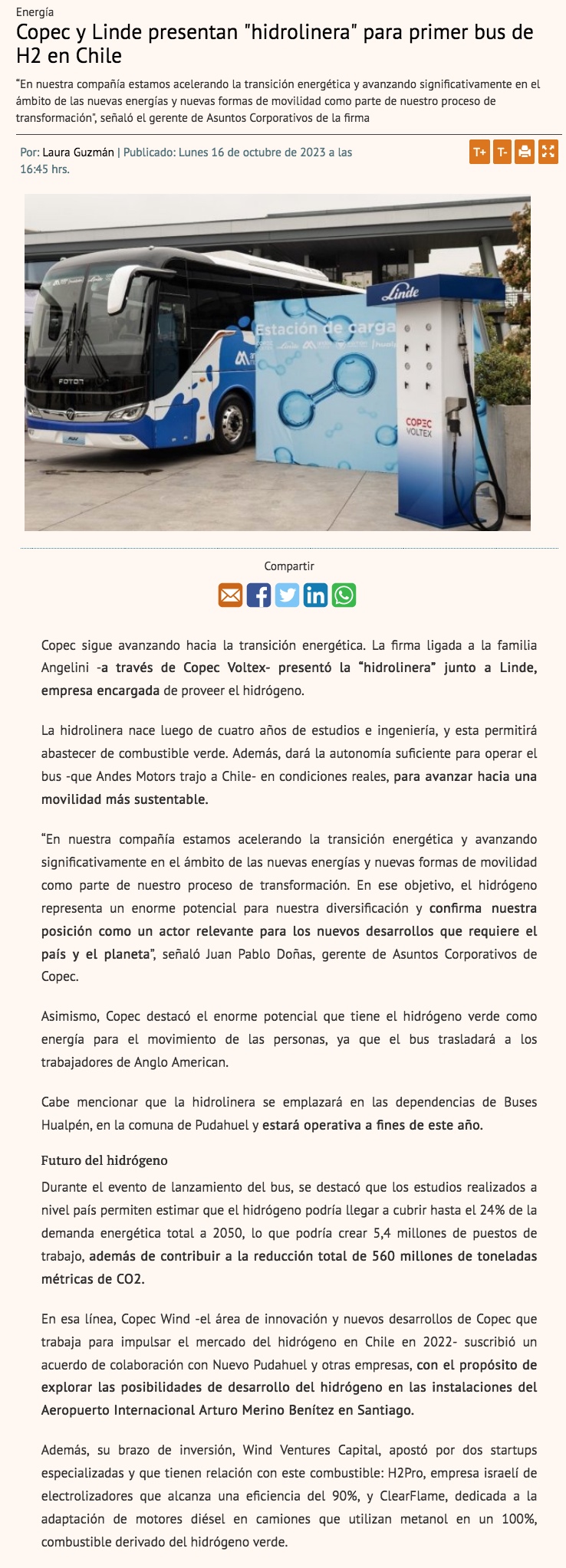 Copec y Linde desarrollaron hidrolinera para primer bus de H2 en Chile - (diariosustentable.com)