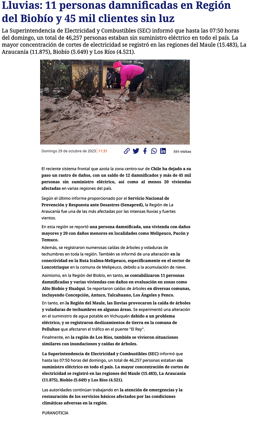 Lluvias y vientos en el sur dejan cortes de suministro eléctrico e interrupción de rutas por caída de árboles y nevadas - (El Mercurio de Santiago)