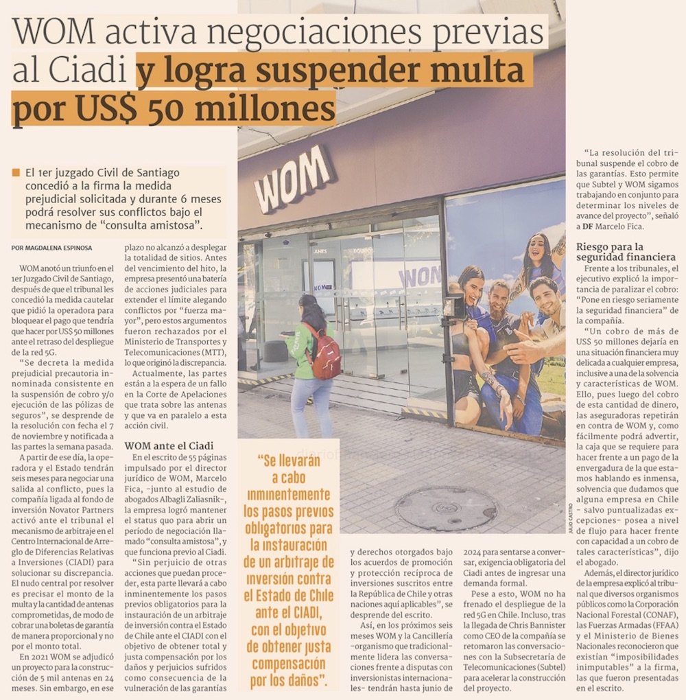 WOM apunta a negociar con el Estado antes de acudir al Ciadi por cobro de boletas de garantía - (El Mercurio de Santiago)