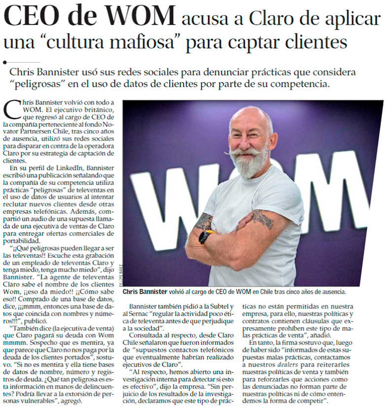 CEO de WOM acusa malas prácticas en ventas e insta a Entel, Movistar y Claro a mejorar regulación - (Diario Financiero)