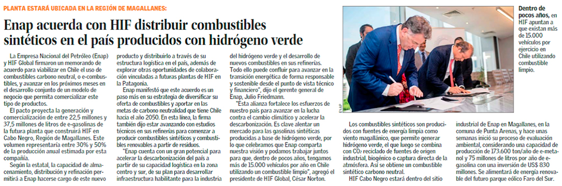 Enap y HIF Global firman acuerdo para producir y comercializar combustibles sintéticos - (El Heraldo (Linares))