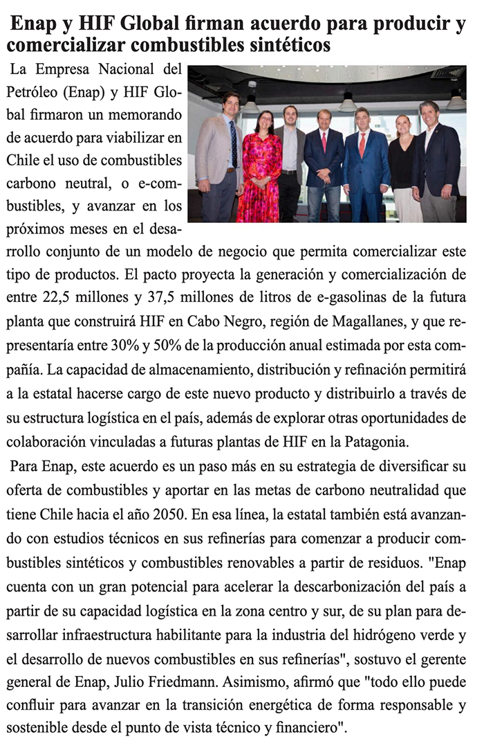 Enap acuerda con HIF distribuir combustibles sintéticos en el país producidos con hidrógeno verde - (El Mercurio de Santiago)